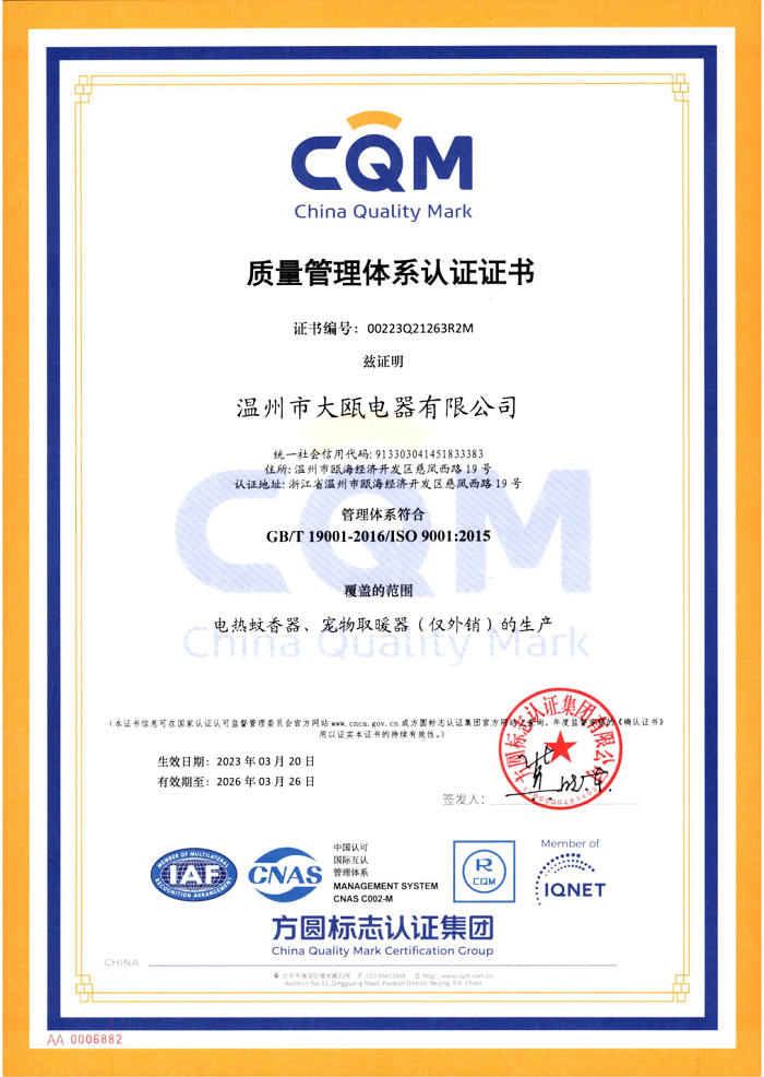 秉承“以人為本,以質取勝”的經營理念,三十余載櫛風沐雨,踐行“成就客戶、價值為本、誠信務實、追求卓越”的核心價值觀。大甌公司堅持以產研一體化的經營模式與差異化的競爭戰略為基點,持續推出細分市場上的多種類產品,豐富產品矩陣,滿足消費者多樣化需求,助力新型驅蚊行業高速發展。
